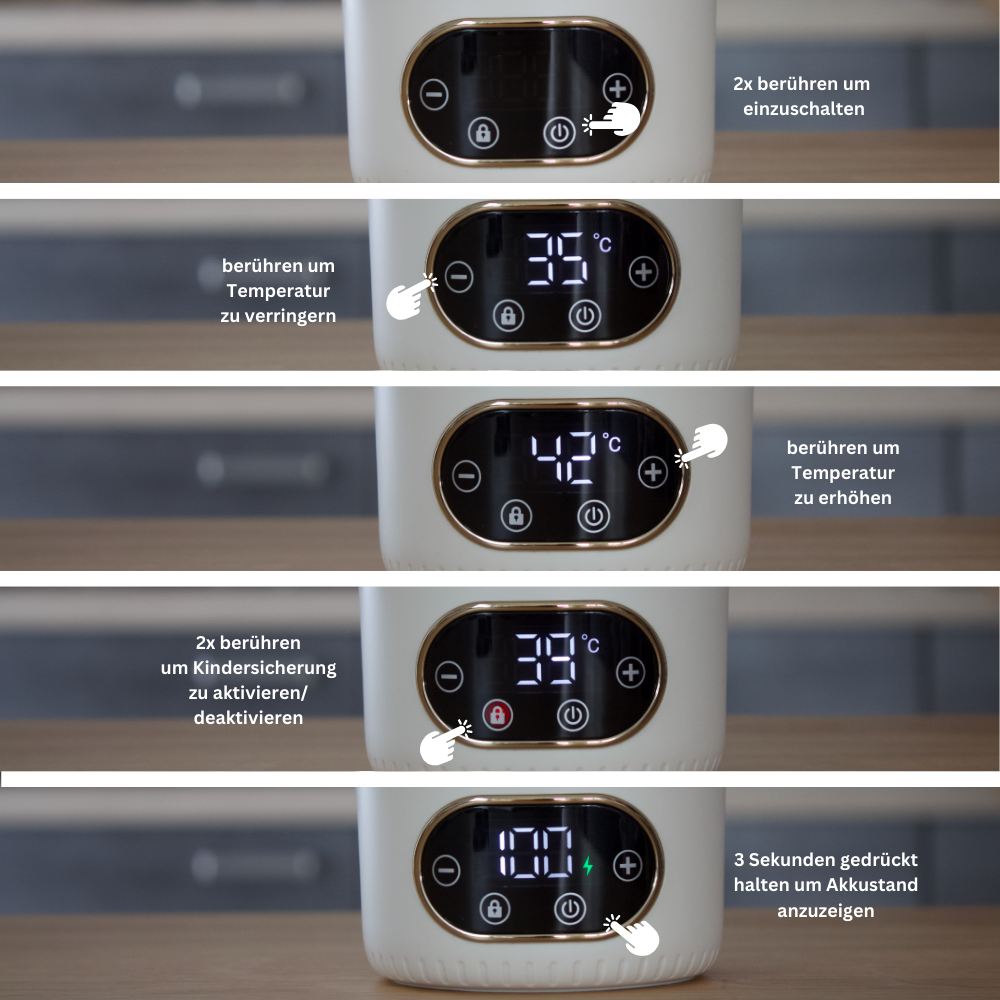 Die Babymilch kann Dank des Akkus problemlos auf bis zu 55 Grad in unter 5 Minuten erhitzt werden und hat eine Füllmenge von 500ml. So bleibt die Milch immer perfekt temperiert, egal wo ihr seid.