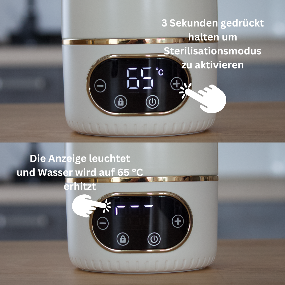 Nachdem du den Flaschenwärmer durch Doppelklicken auf den Powerknopf eingeschaltet hast, gib die gewünschte Menge Flüssigkeit in den Wärmer und drücke 3 Sekunden lang auf die Taste „+“, um in den Desinfektionsmodus zu gelangen. Das Bedienfeld zeigt nach dreimaligem Blinken 65°C an.